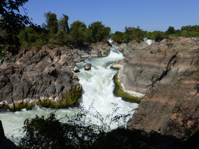 At one point on the side of Don Khone, the normally sedate river Mekong is forced to tumble through chasms and down the rocky river bed. From our vantage point we stood for ages watching the water roar and pour its way angrily southwards.