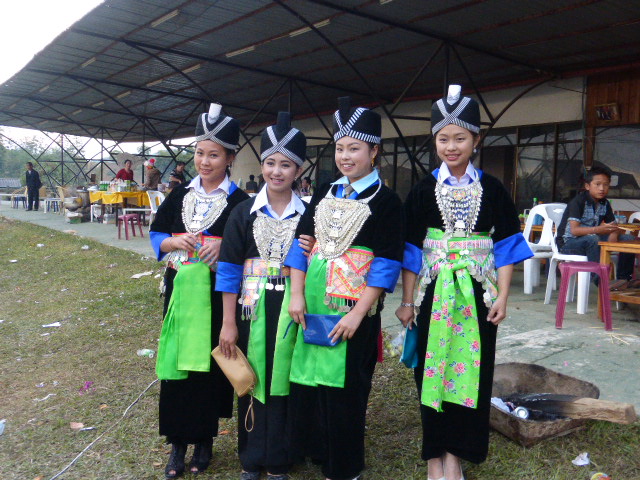 The Hmong people are, or used to be, identified by their elaborate clothing with the different designs and headwear which symbolised which village or even which family they belong to. They do still wear the clothes but the dress code is not so rigid as it used to be, or in the towns at least.