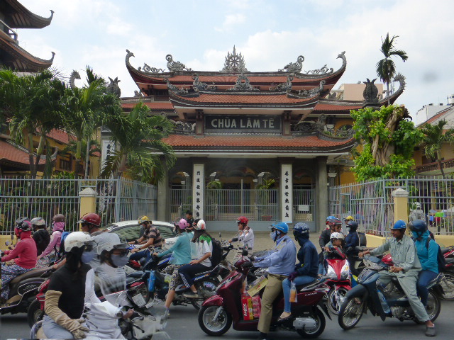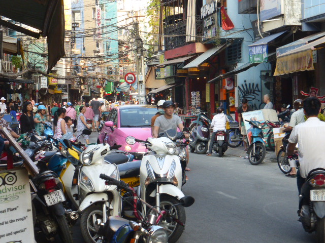 With 8.2 million people Saigon is more populated that Hanoi. The roads are CHAOTIC. In fact the roads are so chaotic that the scooters have rat-runs along the pavements in order to beat the blockages at the junctions-. You have to keep your wits about you as sidewalks are used as bike-parks, shop fronts, street food eating areas and roadways.