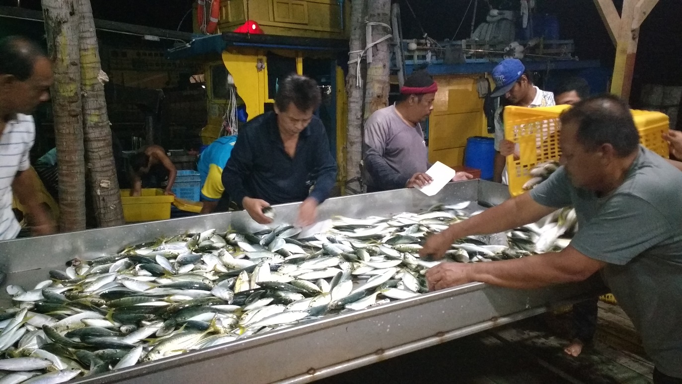 One of the fishing boats had come in and people were busy everywhere. Gangs of men were unloading, passing boxes out along a human chain and others were sorting fish out on the huge tables. Ice blocks were being smashed up and people haggling and weighing out fish in quantities to feed either a family or a small village.