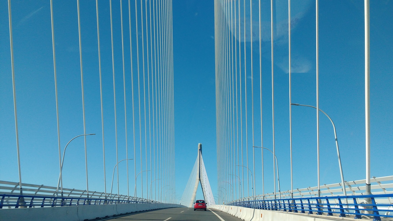 We drove over the brand new bridge (just 14 months old) with a brilliant blue sky above and the sea sparkling a storybook Mediterranean blue below us.
