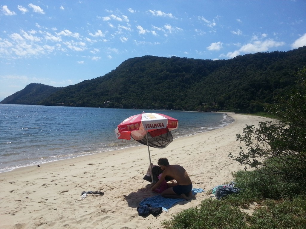 The following day we went for a hike along the beach from Trindade.  This has to be one of the most beautiful stretches of coastline on the planet with its powder white sands, green jungle and the blue sea, but there was another surprise further along the  beach.  A natural swimming arena had been formed from the most gigantic rocks which had fallen at the water’s edge and which now enclose a seawater pool.  And while people splashed and played, thousands of colourful fish swam around us nibbling legs and toes and children clambered high up onto the rocks and tiny motor boats inched in to collect passengers who didn’t want to walk back along the hot sand.