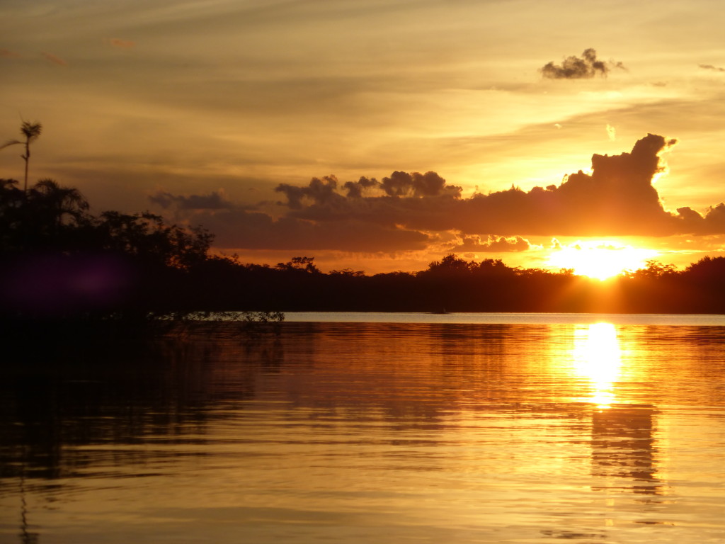 After a short rest following our journey our little group of three split up, and after being told that I should wear swimwear, Javier and I set back out in the canoe to see the most stunning sunset. There were some of the canoes from the other lodges scattered about the centre of the lagoon and some people swimming in the water. I had assumed that we would find a nice beach area to swim from, but I tentatively lowered myself into the luke warm water to discover that, even in the centre of the large lagoon I could touch the sludgy muddy bottom in places. The water level was receding because we were in the dry season but I nervously swam around – after all the laguna was filled with pirhana fish and cayman.