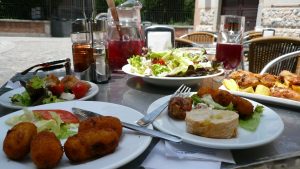 The Palace was impressive, the market was amazing and the traffic horrible, but I would return several times in the future and explore Madrid properly. What struck me was that everything was gigantic. They didn’t go in for delicate fountains or neat buildings. The planners must have had competitions – we want a statue – so let’s make it three times life sized. Let’s build a museum – and that of course must be enormous so that the oversized exhibits will fit in. We need roundabouts -make them the size of small countries so that the vast quantity of traffic can circulate with so much noise that it is impossible to think straight. Eventually we conceded to the heat and settled under a parasol for a very long, lazy Mediterranean lunch.