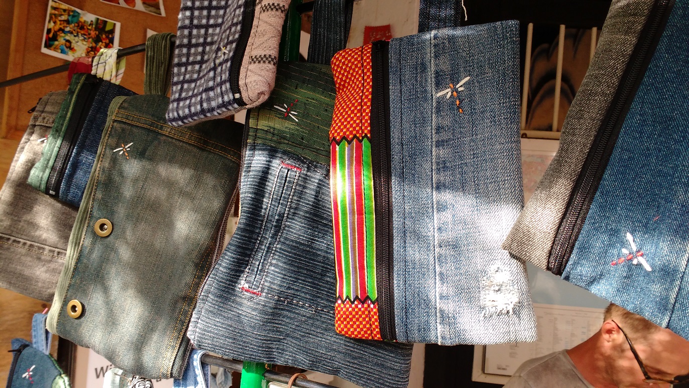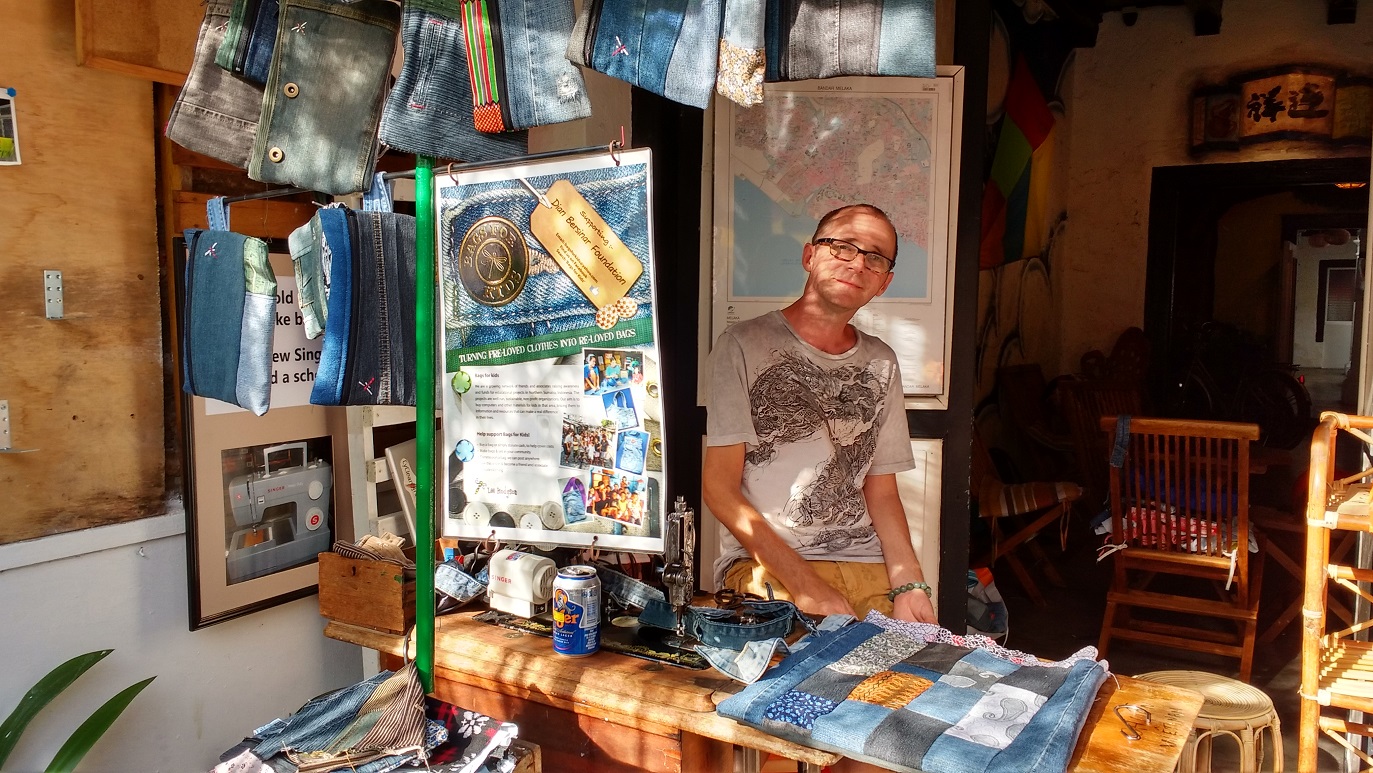 The bags were all different and appeared to be made from pieces of old denim jeans. As I was looking at the bags I noticed a quiet bespectacled guy working at an old treadle Singer sewing machine in the shade in front of the hostel.